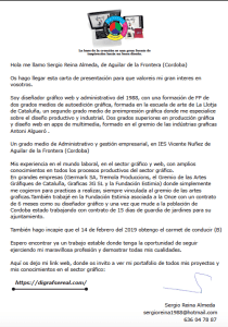 Mi C.V. y Cartas CV ACTUAL carta_presentación Recomendaciones de empresas que he estado :Carta_Fundacion_Estimiacarta_recomanacio_TremolaProduccionscarta_recomendación AlguerocartaGermark_2014carta_recomendacion_DCA Comparte esto: Compartir en X (Se abre en una ventana nueva) X Compartir en Facebook (Se abre en una ventana nueva) Facebook Me gusta Cargando...